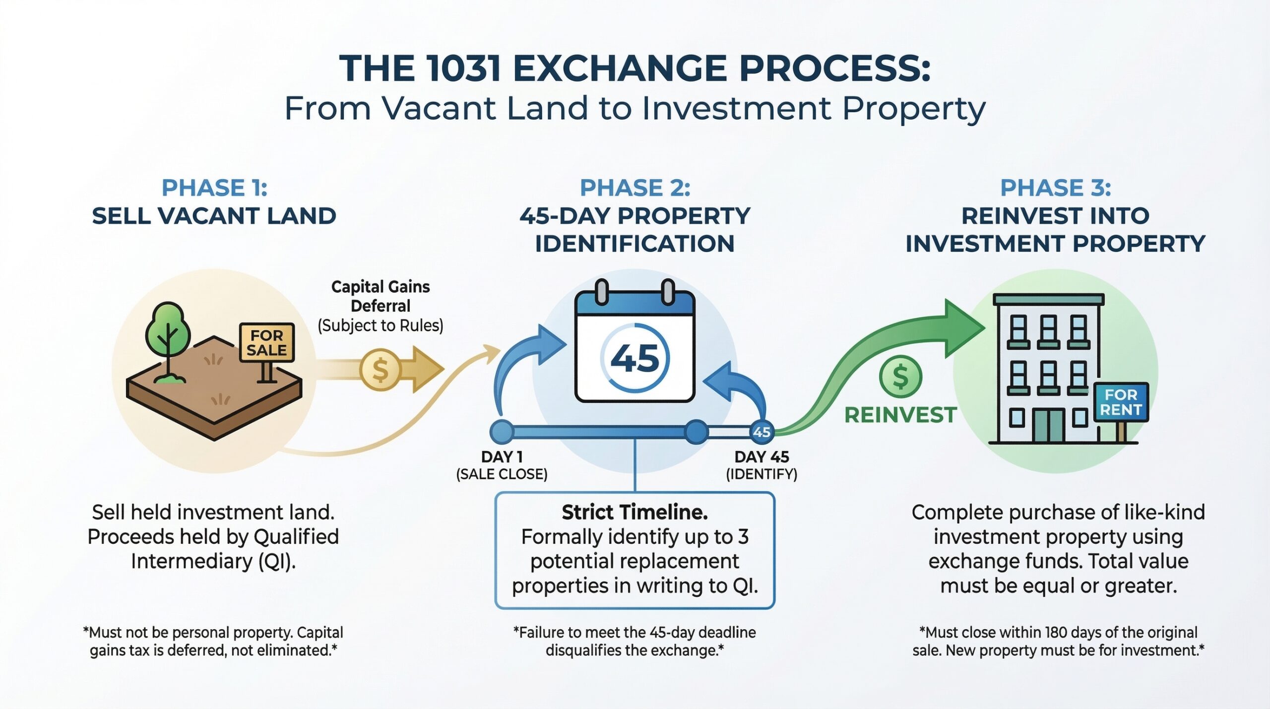 I specialize in helping land owners transition to income-producing assets. I handle everything: finding replacement properties, coordinating 1031 companies, managing timelines, and ensuring IRS compliance