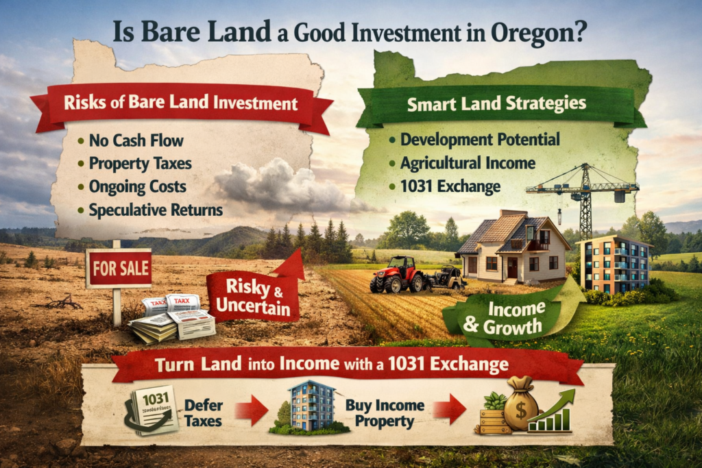 If you own bare land in Oregon that isn’t generating income, you may be sitting on idle capital. While property taxes, insurance, and inflation continue to erode returns, your equity remains locked in a non-performing asset. A properly structured 1031 exchange allows you to defer capital gains taxes and reinvest 100% of your proceeds into income-producing real estate — transforming underperforming land into long-term cash flow and portfolio growth. Here’s how Oregon landowners are using this strategy to reposition for stronger financial outcomes.