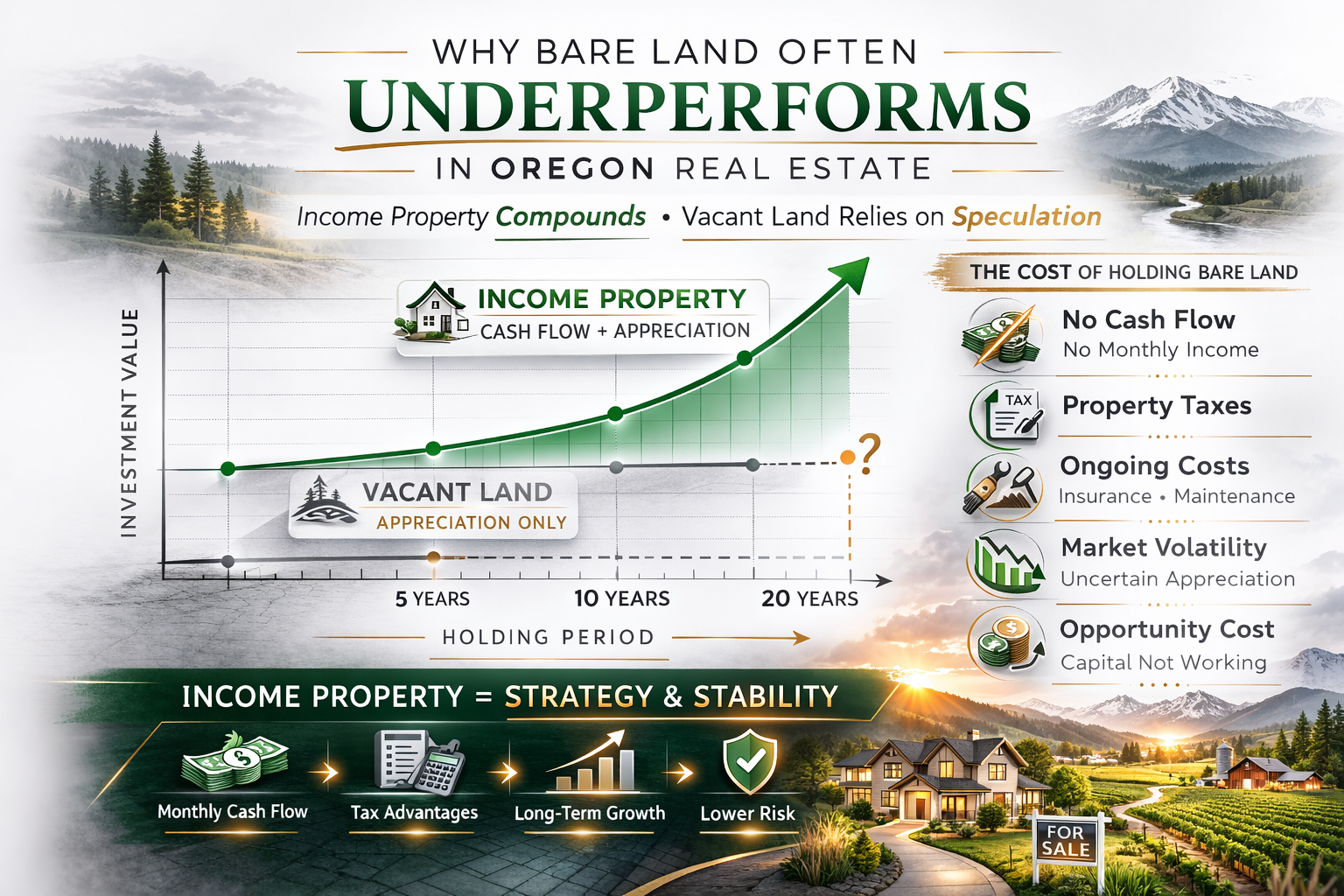 Bare land in Oregon often underperforms compared to income-producing real estate because it generates no cash flow and relies almost entirely on appreciation.